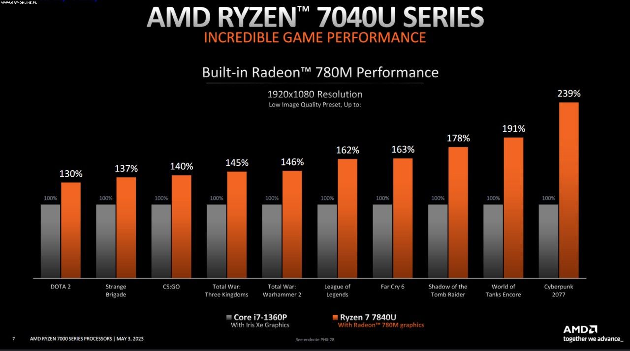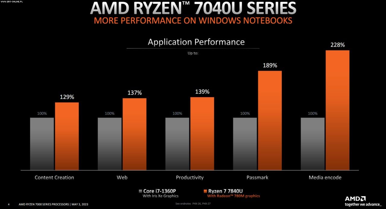 W tym ostatnim teście znaczna przewaga AMD jest zasługą iGPU Radeon 780M, który posiada 12 jednostek obliczeniowych. Nie wiadomo jednak, czy słabsze modele Ryzen 3 i 5 z Radeonem 740M także będą w stanie tak powalczyć z zintegrowanymi grafikami Intela Iris Xe. AMD nie podało daty wprowadzenia procesorów Ryzen 7040U do sprzedaży, lecz pod koniec maja odbywają się targi Computex 2023 – można więc liczyć, producent zdąży zakończyć prace nad nimi do czasu tego wydarzenia.