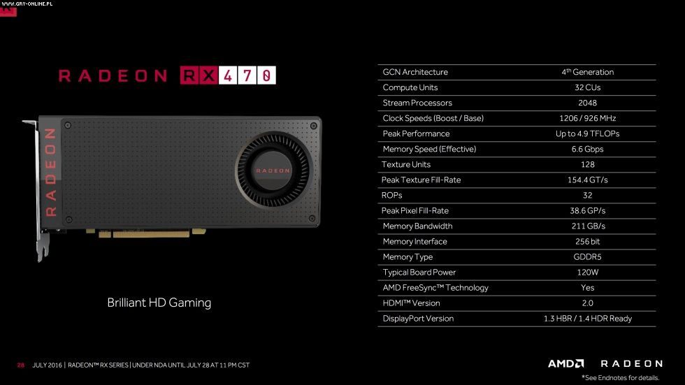 Firma AMD ujawniła oficjalną specyfikację kart grafiki Radeon RX 470 i RX 460 oraz ich daty premier. Pierwsza z nich zadebiutuje na rynku 4 sierpnia, a druga 8 dnia tego samego miesiąca. Układy powinny zainteresować osoby planujące przeznaczyć na zakup nowej karty stosunkowo niewielkie pieniądze, gdyż RX 470 kosztować ma około 150 dolarów (ok. 600 zł), a RX 460 o 50 dolarów mniej, czyli jakieś 400 zł. Oczywiście w Polsce najpewniej będą to nieco wyższe kwoty. Tak czy siak, pierwsza z wymienionych może okazać się naprawdę niezła, gdyż będzie to nieco okrojony RX 480, który bez problemu powinien sobie radzić z grami w rozdzielczości 1080p na wysokich ustawieniach.