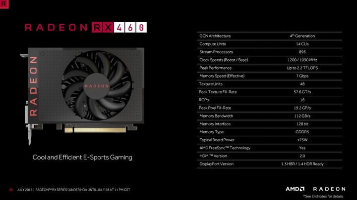 Z kolei RX 460 będzie już zdecydowanie słabszą jednostką, ale zadowoli miłośników gier e-sportowych, w których osiągać ma setki klatek animacji na sekundę. Sprzęt znakomicie sprawdzi się też w laptopach. Porównano go do GTX-a 960M od firmy Nvidia, od którego ma być rzecz jasna mocniejszy. Z racji swojego przeznaczenia, karta ma mieć niewielki pobór prądu, oscylujący w granicach 75 W.