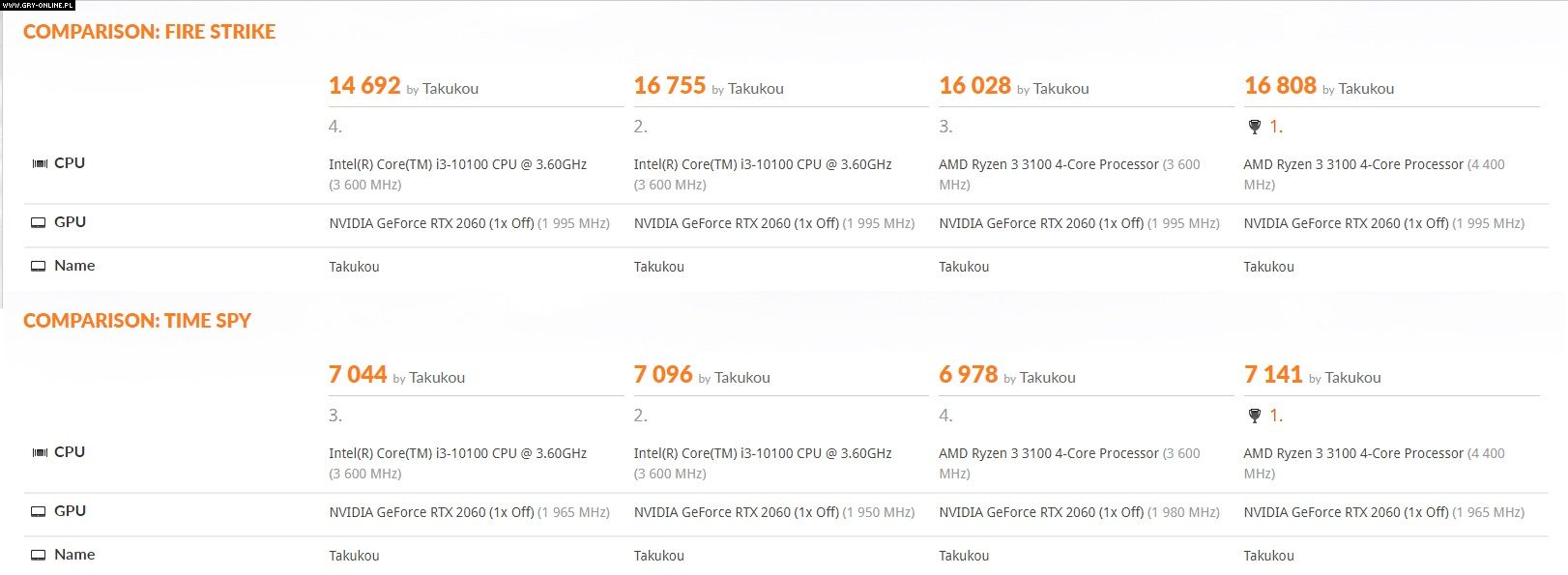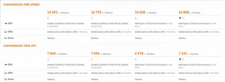 Intel Core i3 10100 i AMD Ryzen 3 3100 - wyniki testów tych procesorów pojawiły się na Twitterze, we wpisie użytkownika @TUM_APISAK. Przeprowadzone benchmarki to 3DMark Fire Strike oraz 3DMark Time Spy.