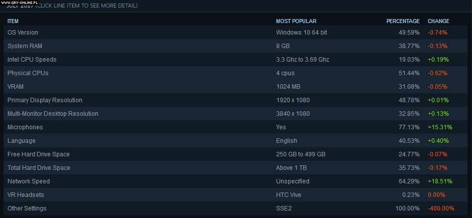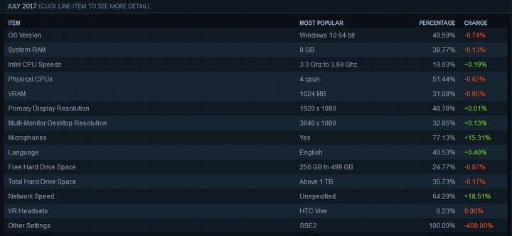Uśredniając wszystkie dane można zauważyć, że standardowy komputer gracza posiada 4-rdzeniowy procesor firmy Intel o taktowaniu od 3.3 Ghz do 3.69 Ghz, który wspierany jest pamięcią RAM w liczbie 8 GB oraz kartą graficzną od firmy Nvidia z pamięcią 1024 MB. Przeciętny użytkownik platformy Steam używa 64-bitowego systemu operacyjnego Windows 10, gra na rozdzielczości ekranu 1920 x 1080 oraz korzysta z mikrofonu podczas rozgrywki. Taki gracz posiada również od 250 GB do 499 GB wolnego miejsca na dysku, którego ogólna pojemność przekracza zazwyczaj 1 TB. Na koniec warto dodać, że niezmiennym i nikłym zainteresowaniem cieszy się sprzęt VR, gdzie najczęściej wybieranym zestawem jest HTC Vive – posiada go 0,23% badanych, co nie zmieniło się od czerwca 2017 roku.
