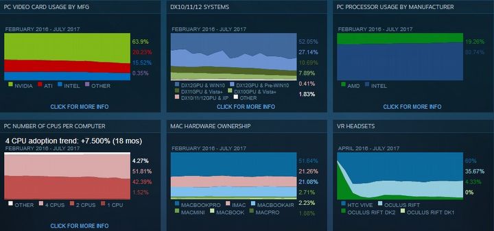 Valve udostępniło wyniki lipcowej ankiety sprzętowej na Steamie. Wielkich zaskoczeń nie ma – gracze najczęściej korzystają z 64-bitowego Windowsa 10, a w ich maszynach górują procesory od Intela oraz karty graficzne firmy Nvidia.