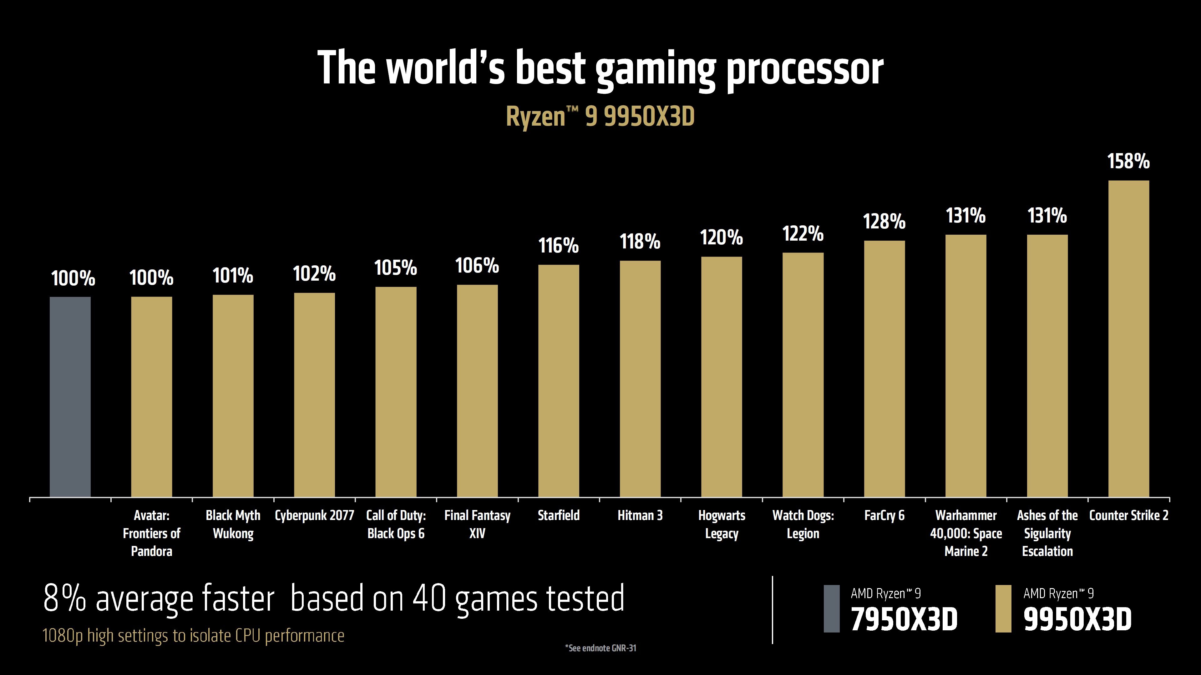 Pierwszy z nich, podobnie jak jego poprzednik Ryzen 9 7950X3D, będzie posiadał 16 rdzenie i 32 wątki. Procesor zaoferuje do 144 MB całkowitej pamięci podręcznej. Niestety nie wiemy jakie będzie taktowanie bazowe układu. Jednak w trybie Boost będzie w stanie osiągnąć 5,7 GHz. Osoby które chciałby się wyposażyć w procesor muszą się przygotować na zakup porządnego chłodzenia, gdyż TPD układu wynosi 170W. Takie parametry pozwoliły na znaczną poprawę wydajności. W grze Counter Strike 2, procesor osiąga o 58% lepsze osiągi względem Ryzena 7 7950X3D. Poniżej możecie zobaczyć porównanie wydajności w grach przygotowane przez AMD