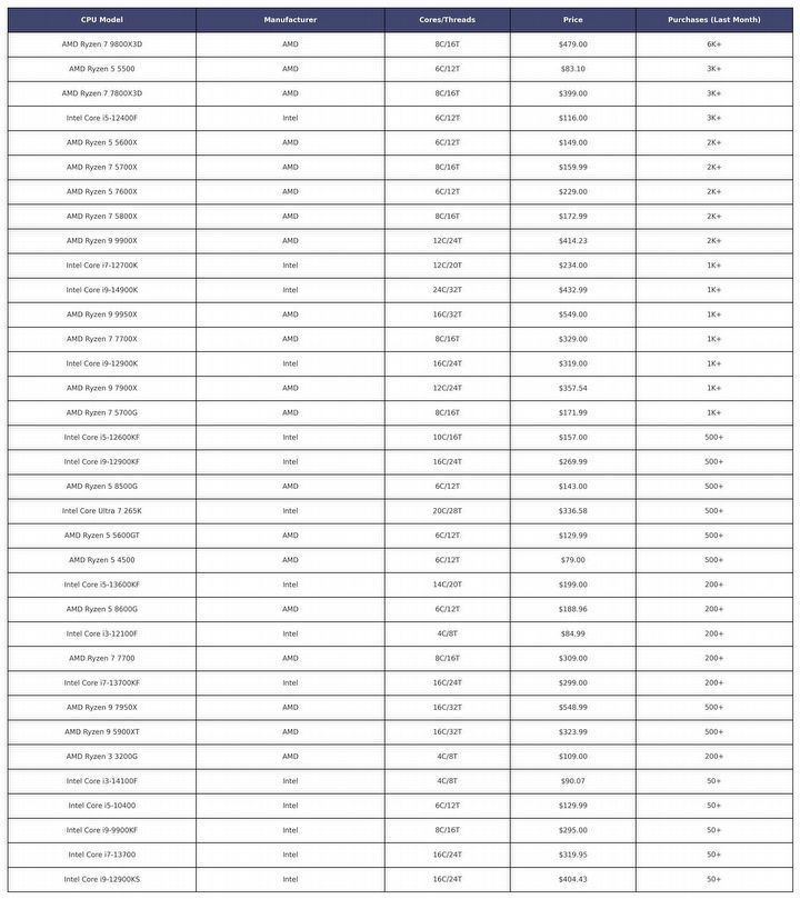 Co ciekawe, na drugim miejscu uplasował się sześciordzeniowy Ryzen 5 5500, który na rynku jest już blisko 3 lata. Procesor ten wciąż jest bardzo częstym wyborem wśród graczy, mimo faktu, że bestią do gier nie jest w porównaniu do chipu z pierwszego miejsca. Wynik ten jest zapewne zasługą atrakcyjnej ceny 83,10 dolarów (319 złotych bez VAT). Dzięki temu ten Ryzen może pochwalić się wynikiem ponad 3000 sprzedanych sztuk w zeszłym miesiącu. Zaraz za tym układem na trzecim miejscu uplasował się Ryzen 7 7800X3D.