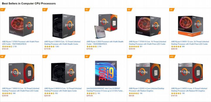 Dane znajdują odzwierciedlenie w statystkach sklepów. Dla przykładu, poniżej znajdziecie top 10 sprzedaży procesorów na Amazonie. Tabela mówi sama za siebie.