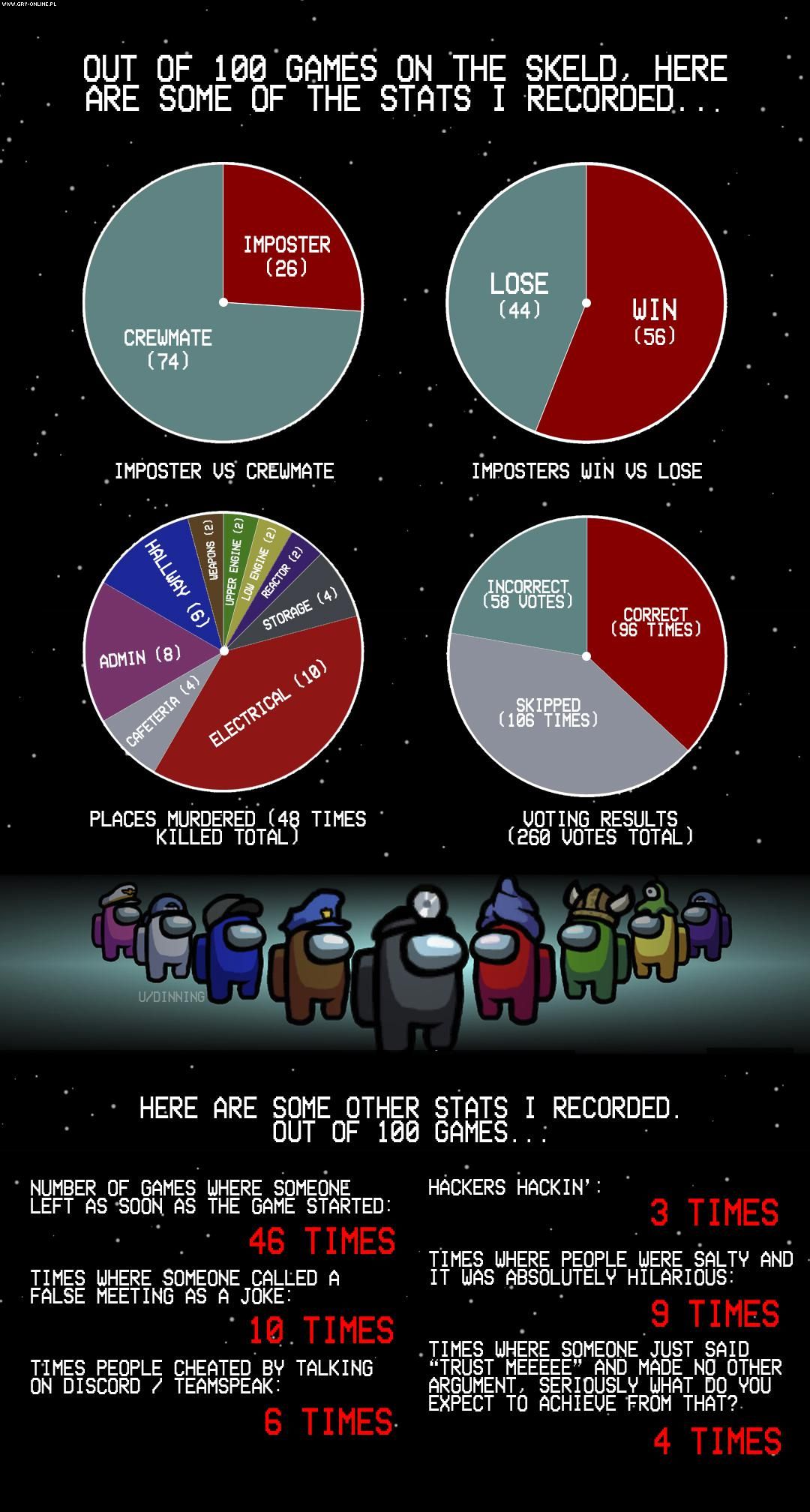 Czy bawiąc się w Among Us zastanawialiście się kiedyś, jak Wasze poszczególne rozgrywki wyglądają pod względem statystyk? Ile razy załoga miała rację podczas głosowania, kto jest oszustem? Ile razy spotkaliście się z nieuczciwymi praktykami? W których miejscach na mapie najczęściej dochodziło do zabójstw? Te i inne pytania chodziły po głowie jednego z użytkowników Reddita o pseudonimie Dinning. W końcu postanowił znaleźć na nie odpowiedzi. Otóż prześledził on swoje ostatnie sto gier w Among Us rozegrane na mapie The Skeld (czyli tej umiejscowionej na statku). Dane, które zebrał w wyniku tej analizy, umieścił na eleganckiej infografice. Możecie ją zobaczyć poniżej.
