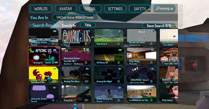 Oto jak prezentuje się mapa z Among Us autorstwa Jara w wynikach wyszukiwania w aplikacji VRChat (oznaczona czerwoną ramką).