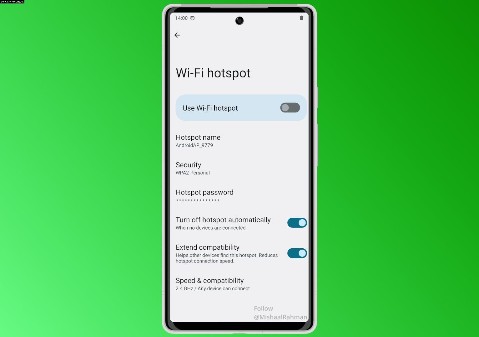 Według udostępnionych przez Mishaala Rahmana informacji najnowsza wersja beta systemu Android 14 otrzymała dodatkowe opcje konfiguracji hotspotu. Jedną z nich jest możliwość wyboru częstotliwości na jakiej ma pracować. Dodatkowo pojawiła się opcja zwiększenia kompatybilności.