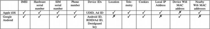 Podczas gdy iOS automatycznie wysyła dane z Siri, przeglądarki Safari, iCloud, system Android kolekcjonuje informacje z Chrome, YouTube, Dokumentów Google, Safetyhub, Google Messenger, zegara systemowego i paska wyszukiwania Google. Kategorie zbieranych danych, gdy użytkownik nie jest nawet zalogowany, przedstawia poniższa tabelka, opracowana przez profesora Leitha: