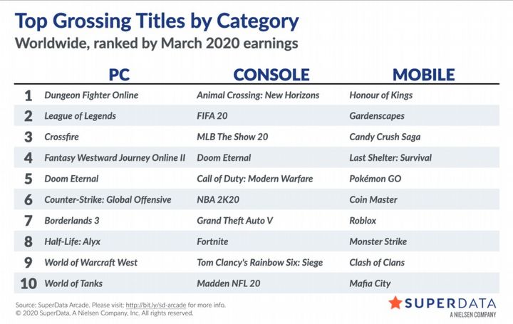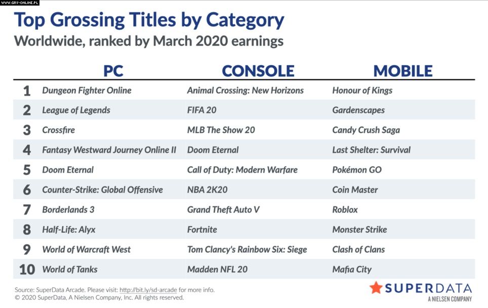 Zestawienie dziesięciu najlepiej zarabiających gier marca na PC, konsolach oraz urządzeniach mobilnych. Źródło: SuperData..