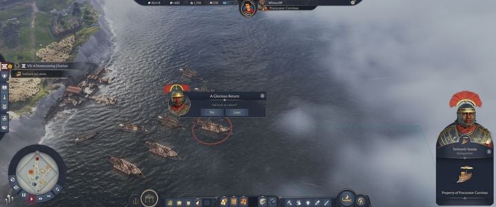 Po powrocie do Latium czeka was ceremonia triumfu oraz odzyskanie Juliany. Następnie udacie się na osobistą audiencję z cesarzem, który pozwoli wam wybrać jedną z trzech nagród – wyśmienity i unikalny okręt wojenny, sto tysięcy denarów lub uwolnienie waszego głównego doradcy, Ben-Baaliona, z niewoli (uwolnienie go nie przyniesie wam żadnych nagród, a wolny Ben-Baalion pozostanie z wami z własnej woli).