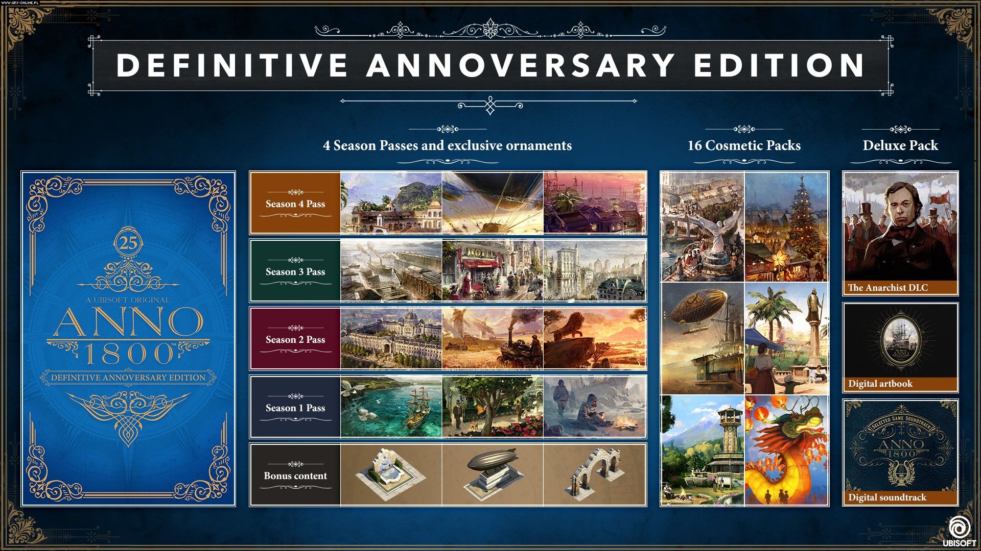 Zgodnie z podtytułem jest to kompletne wydanie Anno 1800, zawierające wszystkie dodatki z czterech sezonów, pakiety deluxe, bonusy oraz 16 pakietów kosmetycznych. A właściwie 13, bo trzy z nich to zupełnie nowe DLC, które zostaną wydane w przyszłym roku. Nie podano szczegółów odnośnie do ich zawartości.