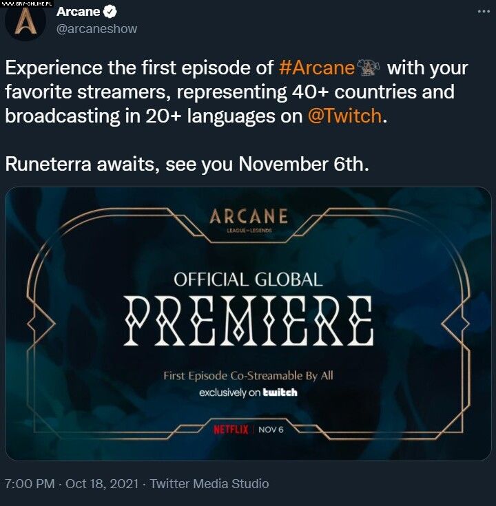 Doświadcz pierwszego epizodu Arcane wraz ze swoimi ulubionymi streamerami z ponad 40 krajów i w ponad 20 językach. Runeterra czeka, widzimy się 6 listopada [o 19:00 czasu pacyficznego, czyli w Polsce 7 listopada o czwartej nad ranem – dop. red.]