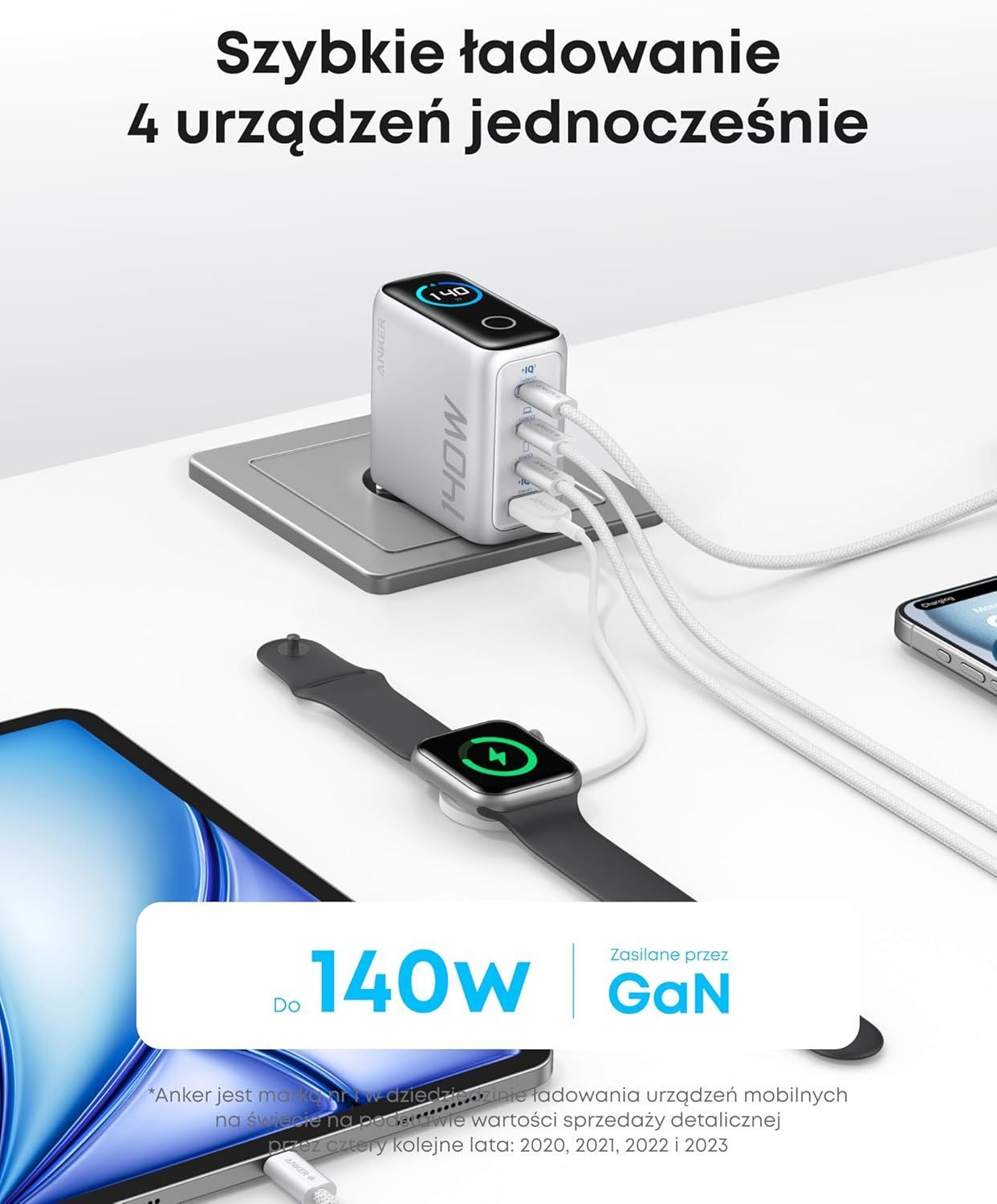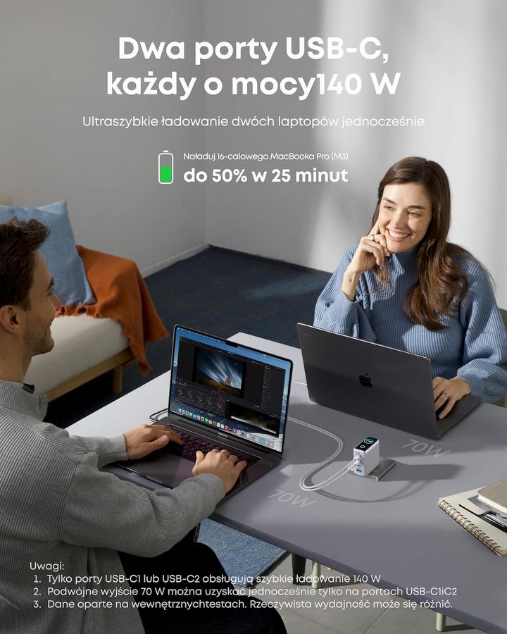 A skoro o portach mowa, do dyspozycji mamy aż cztery – trzy USB-C oraz jeden USB-A. Najważniejsze jest jednak to, że dwa porty USB-C mogą jednocześnie ładować urządzenia z maksymalną mocą 140 W, o ile oczywiście sprzęt obsługuje takie wartości. To już poziom, który spokojnie pozwala zasilić nawet bardziej wymagające laptopy. Co istotne, w zestawie znajdziemy także 1,5-metrowy kabel, który umożliwia osiągnięcie takich parametrów bez konieczności dokupowania dodatkowych akcesoriów.