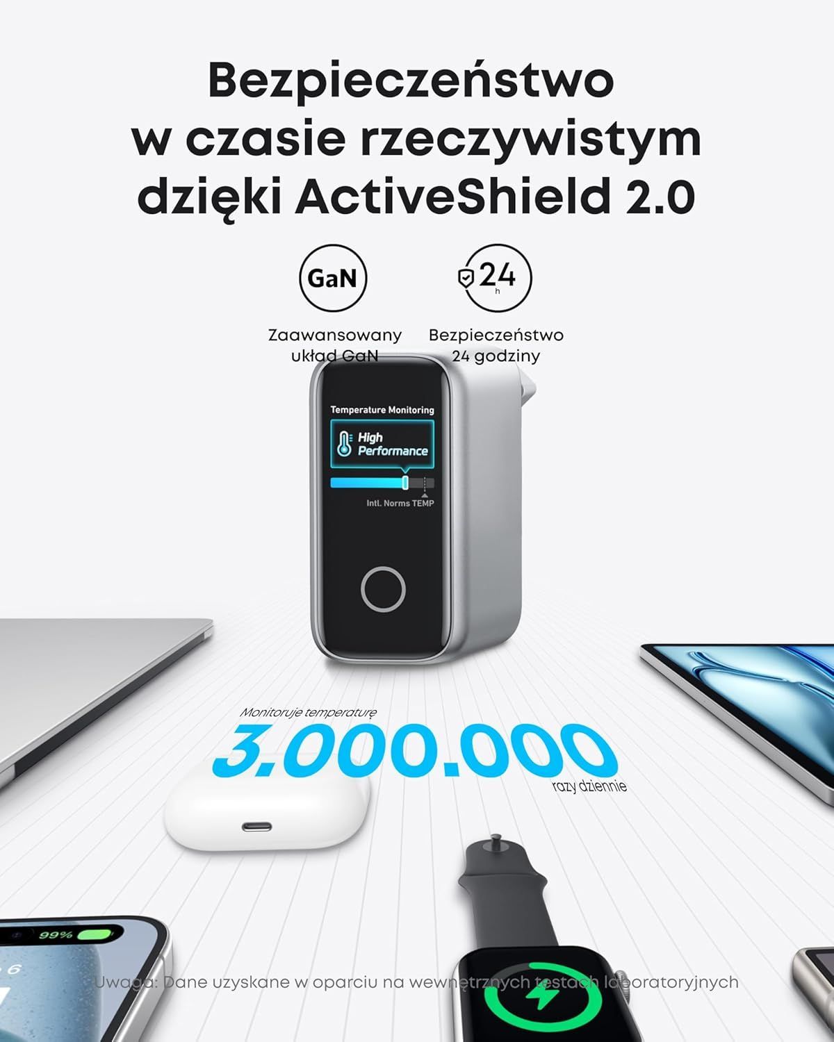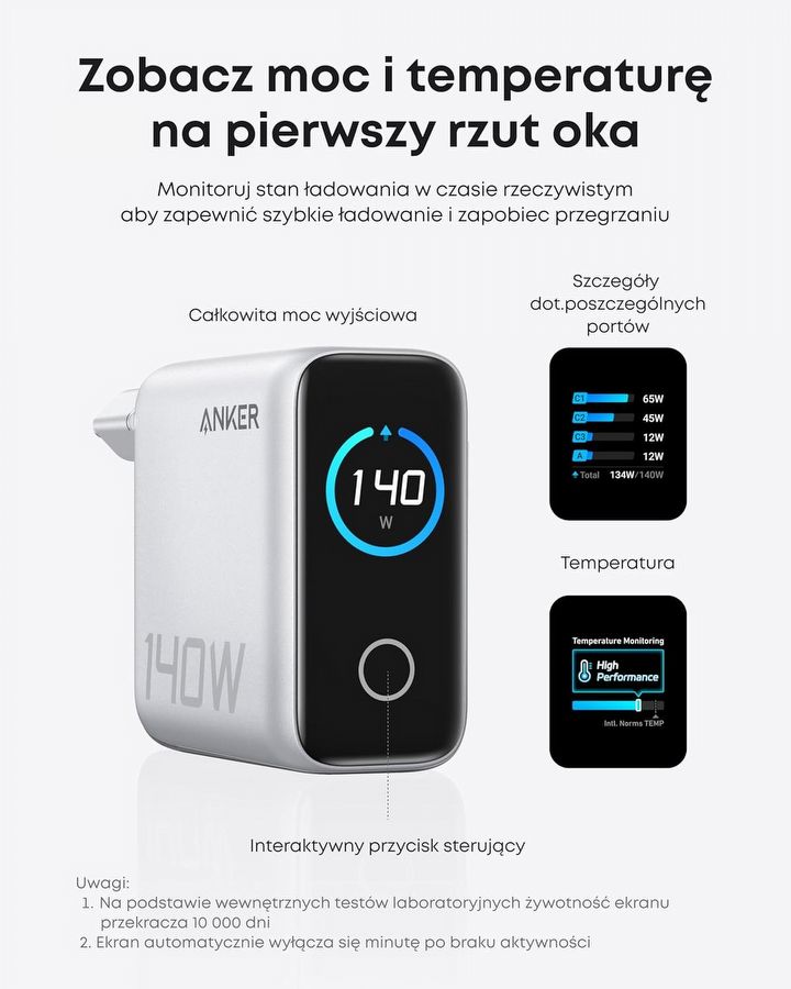 Model B2697 od razu sprawia wrażenie sprzętu z wyższej półki. Jednym z najbardziej wyróżniających się elementów jest wbudowany wyświetlacz, który pokazuje szczegółowe informacje o procesie ładowania – od aktualnej mocy, przez temperaturę, aż po dane dotyczące konkretnych portów.