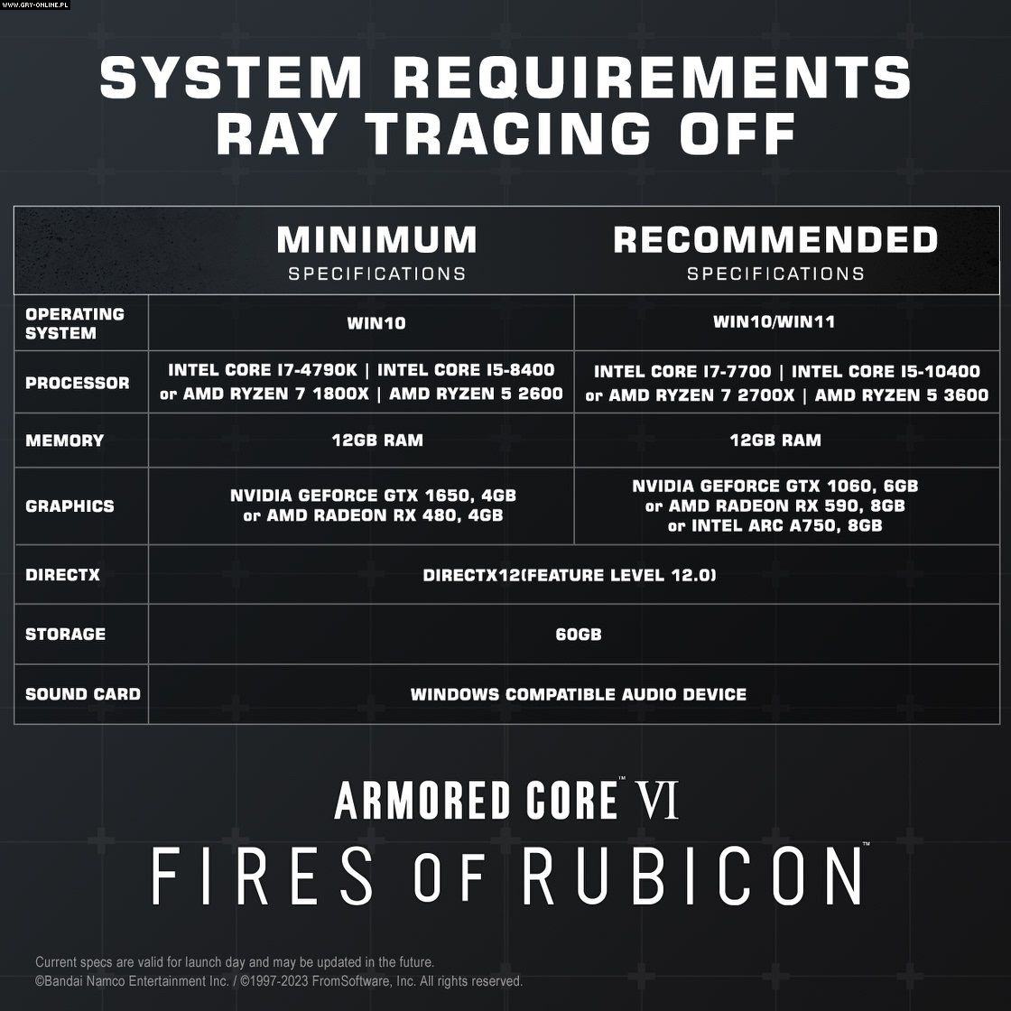 Na szczęście FromSoftware nie przesadziło ze zmianą GPU od „zielonych”. Dotychczas minimalna konfiguracja uwzględniała kartę GeForce GTX 960, którą teraz zastąpiono modelem GTX 1650. O dziwo układ od AMD pozostał ten sam.