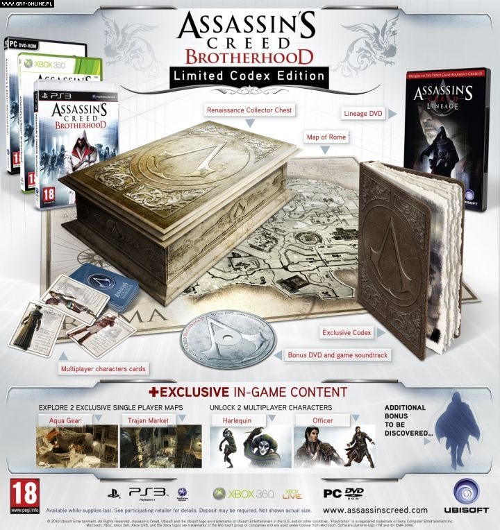 W skład edycji kolekcjonerskiej Assassin’s Creed: Brotherhood wchodzi renesansowe, kolekcjonerskie pudełko, mapa Rzymu, ekskluzywny Kodeks Asasyna, karty postaci z multiplayera, płyta DVD z filmem Assassin’s Creed: Rodowód, płyta DVD ze ścieżką dźwiękową i innymi dodatkami, dwie ekskluzywne mapy do trybu dla pojedynczego gracza (Aqua Gear i Trajan Market), dwie dodatkowe postacie do trybu multiplayer (Harlequin i Officer), a także bliżej nieokreślona dodatkowa zawartość, która dopiero zostanie ujawniona.