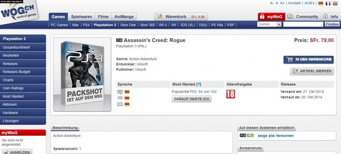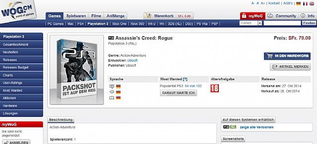 Podczas wycieku pierwszych informacji dotyczących gry Assassin's Creed: Unity, dowiedzieliśmy się, że firma Ubisoft pracuje również przy jeszcze jednej odsłonie serii, dedykowanej starszym konsolom. Projekt ochrzczono mianem Assassin's Creed: Comet, jednak nie wiemy na jego temat niemal nic. Ponoć akcja produkcji rozgrywać ma się w Rzymie i to by było na tyle. Niestety, dziś znowu nie mamy do przekazania żadnych konkretów w tej sprawie, ale jeden ze szwajcarskich sklepów – WOG.ch – zamieścił w swojej ofercie Assassin’s Creed: Rogue na PlayStation 3, co sugeruje, że Comet zmieniło właśnie podtytuł. Pozycja została szybko usunięta, ale z racji, że w Internecie nic nie ginie, to zachowało się potwierdzenie w postaci poniższego screena. Możemy z niego wyczytać, że tytuł ma zadebiutować na rynku pod koniec października.