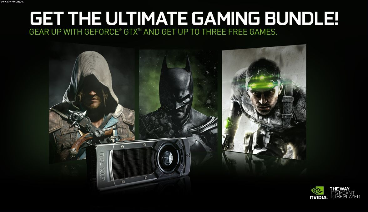 Firma Nvidia przygotowała ciekawą akcję promującą najnowsze karty grafiki. Od 28 października 2013 roku do każdego modelu GeForce GTX 660, 670, 680, 690 oraz 760 dołączane będą w prezencie cyfrowe edycje dwóch pecetowych gier – Assassin’s Creed IV: Black Flag oraz Splinter Cell: Blacklist. Nabywcy kart GeForce GTX 770, 780 lub TITAN otrzymają dodatkowo (oprócz wcześniej wymienionych tytułów) Batman: Arkham Origins. Oferta będzie dostępna wyłącznie u partnerów handlowych Nvidii. Na razie nie podano, o jakie sklepy dokładnie chodzi.
