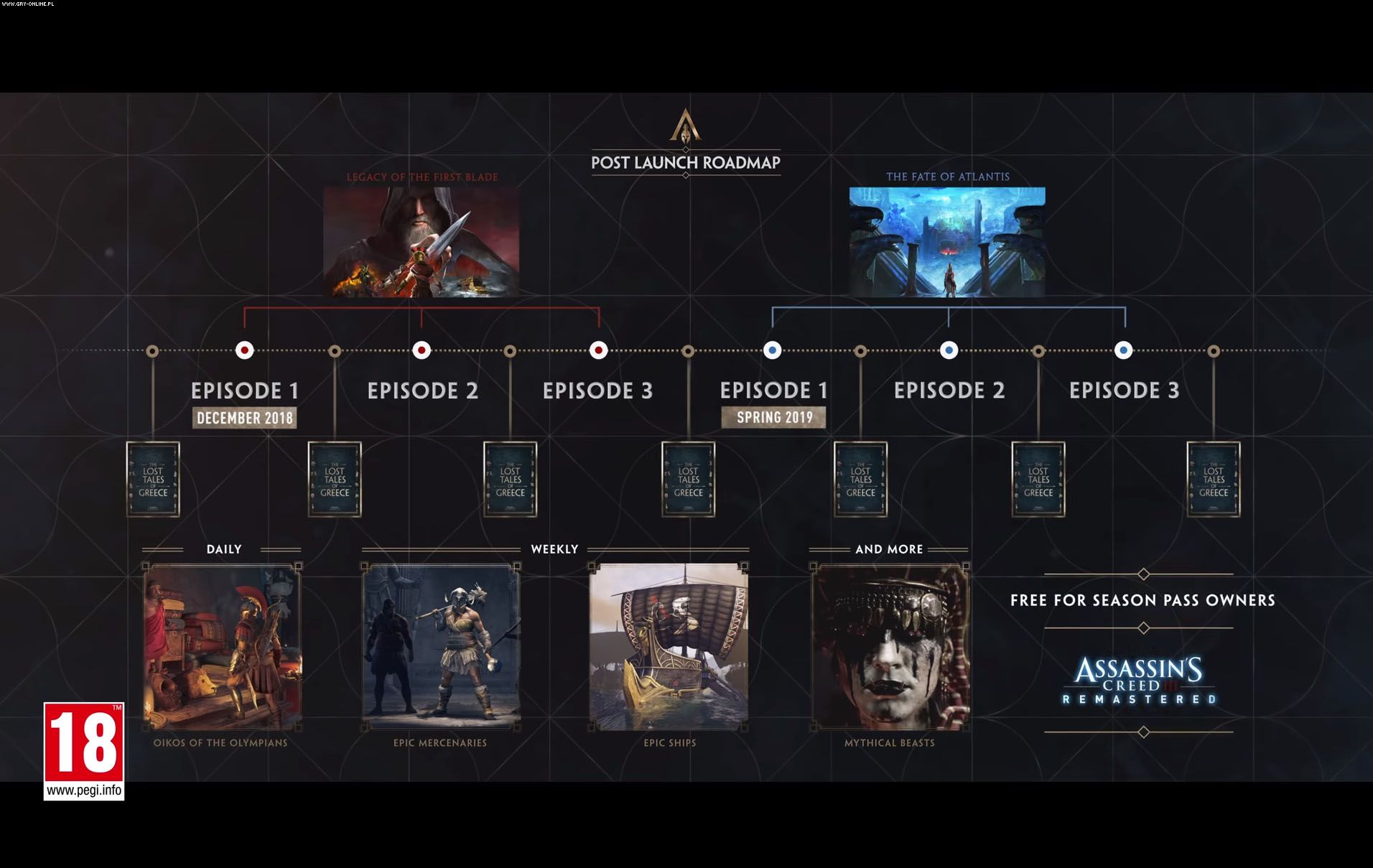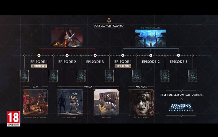 Darmowych misji będzie więcej. Będą one udostępniane pomiędzy kolejnymi rozdziałami płatnych dodatków, oferowanych w ramach dwóch kampanii wchodzących w skład przepustki sezonowej: Legacy of the First Blade oraz The Fate of Atlantis. Poza tym dostaniemy szereg wydarzeń (dziennych i tygodniowych) oraz polowania na mityczne bestie. Poniżej mapa drogowa planowanych dodatków.
