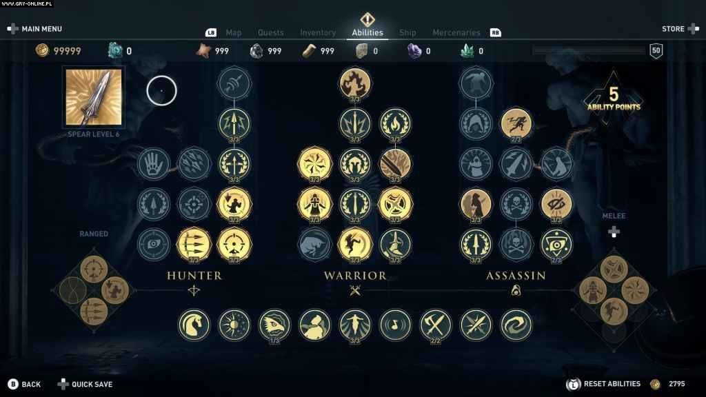 - Rush Assassination – rzut włócznią Leonidasa zadającą 150% obrażeń zabójcy. Można z tego zrobić kombos z maksymalnie trzema takimi atakami.