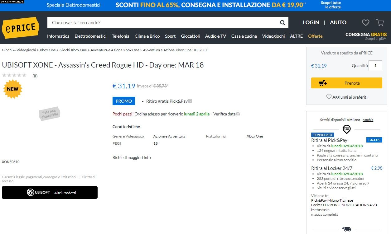 W sieci pojawiły się plotki na temat nowej wersji Assassin's Creed: Rogue. Grę wydano w listopadzie 2014 roku na konsolach PlayStation 3 i Xbox 360, a kilka miesięcy później – w marcu 2015 roku – na PC-tach. Teraz podejrzewa się, że wkrótce dołączą do nich edycje na PlayStation 4 i Xboksa One. Tak przynajmniej twierdzi kilka włoskich sklepów (dzięki, AccessTheAnimus) – eprice.it, reluxshop.it oraz webster.it. Według nich Assassin's Creed: Rogue HD sprzedawany będzie w cenie około 30 euro (ok. 126 zł) i ukaże się w połowie marca 2018 roku – u jednego ze sprzedawców widnieje data 15 marca, a u drugiego 18.