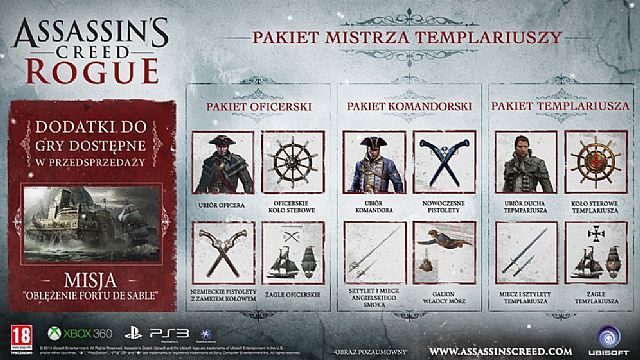 Dwa dni temu firma Ubisoft oficjalnie zapowiedziała grę Assassin's Creed: Rogue. Dzień później okazało się, że produkcja będzie pozbawiona trybu multiplayer, a dziś poznaliśmy zawartość edycji kolekcjonerskiej, którą można już zamawiać w sklepie Uplay, w cenie 279,90 zł. Przed wypunktowaniem poszczególnych elementów zestawu, warto wspomnieć, że osoby, które złożą zamówienia przedpremierowe, otrzymają kilka cyfrowych dodatków, w tym: