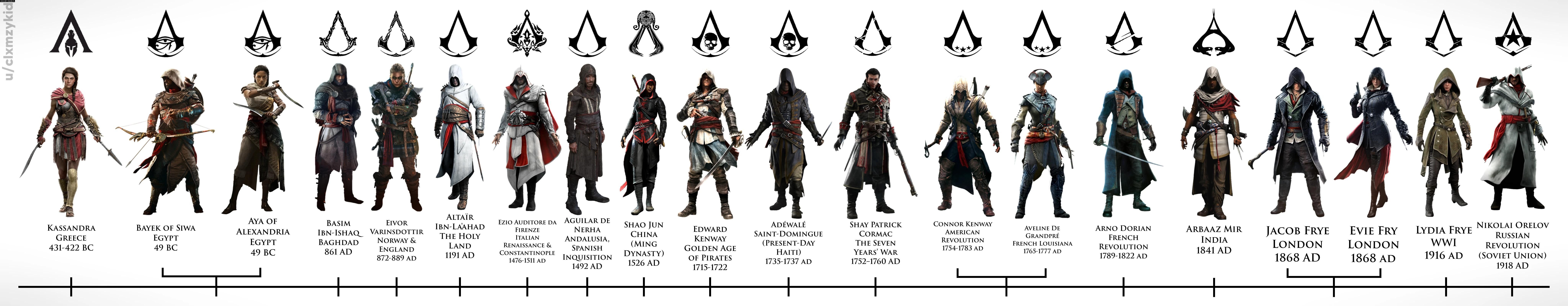 Clxmzykid w swojej pracy zawarł znakomitą większość bohaterów znanych z serii, poczynając od pierwszej pod względem chronologicznym Kassandry znanej z Assassin's Creed: Odyssey, a kończąc na pochodzącym z Rosji Nikolaiu Orelovie działającym na początku XX wieku.