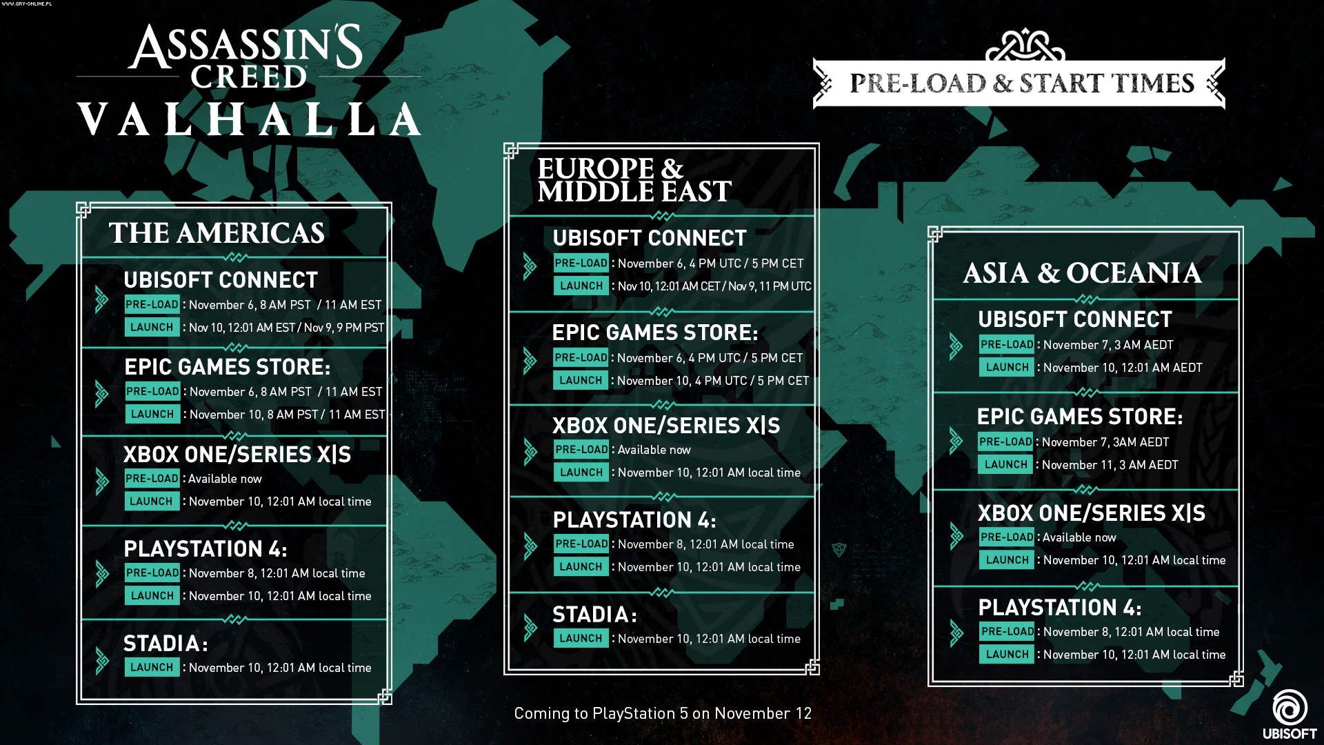 Jak widzicie na powyższej grafice, Assassin’s Creed: Valhalla dostępne jest w pre-loadzie na PC i Xboksach od wczoraj, a wersja na PS4 pojawi się już jutro o godzinie 00:01 lokalnego czasu. Tytuł będziemy mogli uruchomić i w niego zagrać 10 listopada. Podział na platformy wygląda następująco: