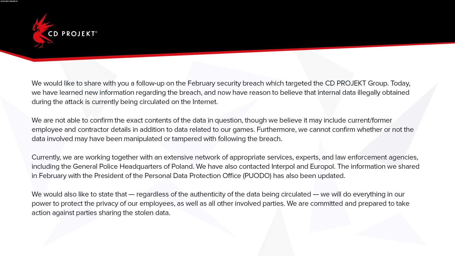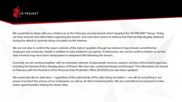 CD Projekt przedstawił nowe informacje w związku z atakiem hakerskim na serwery firmy, który miał miejsce w lutym tego roku. Polskie przedsiębiorstwo – odpowiedzialne m.in. za serię Wiedźmin oraz Cyberpunka 2077 – twierdzi, że ma podstawy sądzić, iż wykradzione przez hakerów i dostępne w Internecie informacje to nie tylko kody źródłowe niektórych gier, ale również dane osobowe obecnych i byłych jego pracowników.