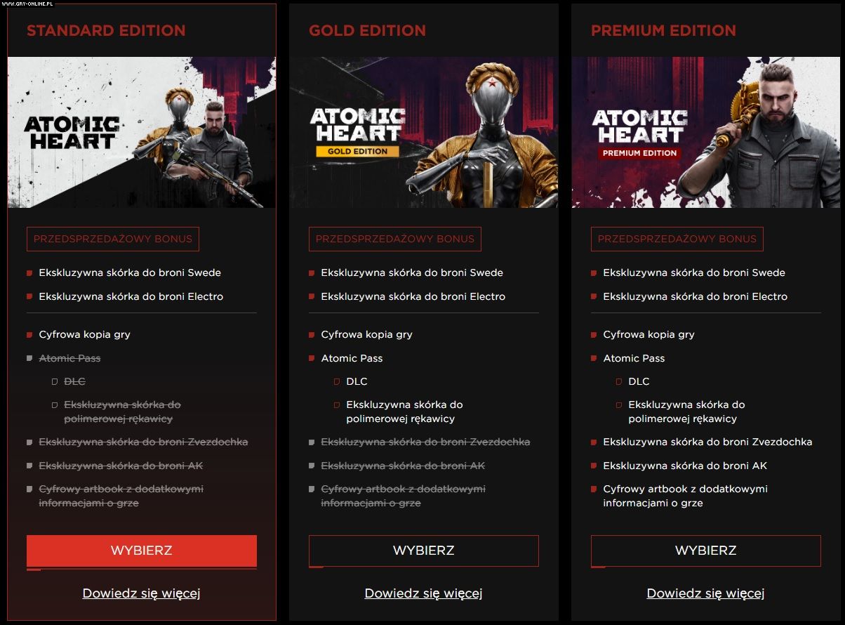 Można także składać zamówienia przedpremierowe na Atomic Heart – np. na Steamie. Ceny gry są różne i zależą od tego, na jaką edycję się zdecydujemy – „zwykłą” (219,99 zł), Gold (329,99 zł) czy Premium (379,99 zł). O tym, co oferują poszczególne wydania, dowiecie się z poniższej grafiki.