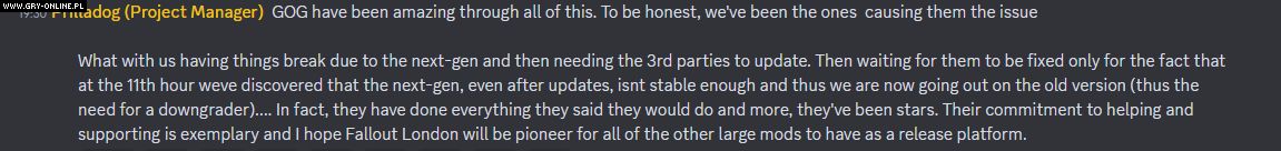 Dwa miesiące temu moderzy nawiązali współpracę z platformą GOG – to właśnie za jej sprawą dojdzie ostatecznie do publikacji moda. W tym celu twórcy Fallout: London przekazali pliki gry GOG-owi, aby specjaliści serwisu mogli przeprowadzić kontrolę jakości.