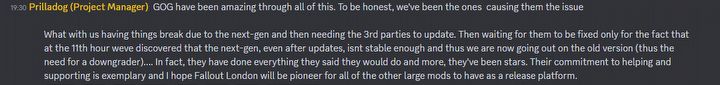 W międzyczasie twórcy kontynuowali prace nad rozbudowanym modem i w pewnym momencie zorientowali się, że next-genowy update jest na tyle niestabilny, że trzeba będzie go usunąć z Fallouta 4, aby móc bawić się w postapokaliptycznym Londynie. Taka właśnie informacja pojawiła się na oficjalnym serwerze Discord Team FOLON.