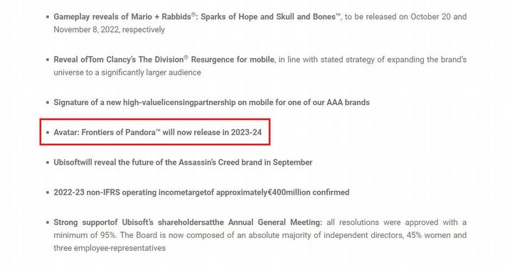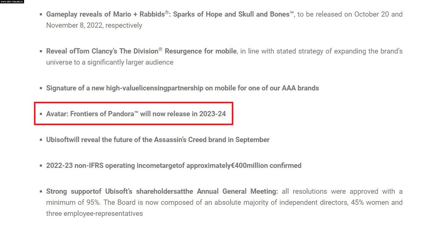 Przynoszę złe wieści dla wszystkich osób, które wyczekują premiery gry Avatar: Frontiers of Pandora od studia Ubisoft Massive. Jak wynika z dzisiejszego raportu finansowego francuskiej firmy za pierwszy kwartał roku fiskalnego 2022/23, ów tytuł zaliczy opóźnienie i ukaże się w roku podatkowym 2023/24 (czyli w okresie od 1 kwietnia 2023 r. do 31 marca 2024 r.).
