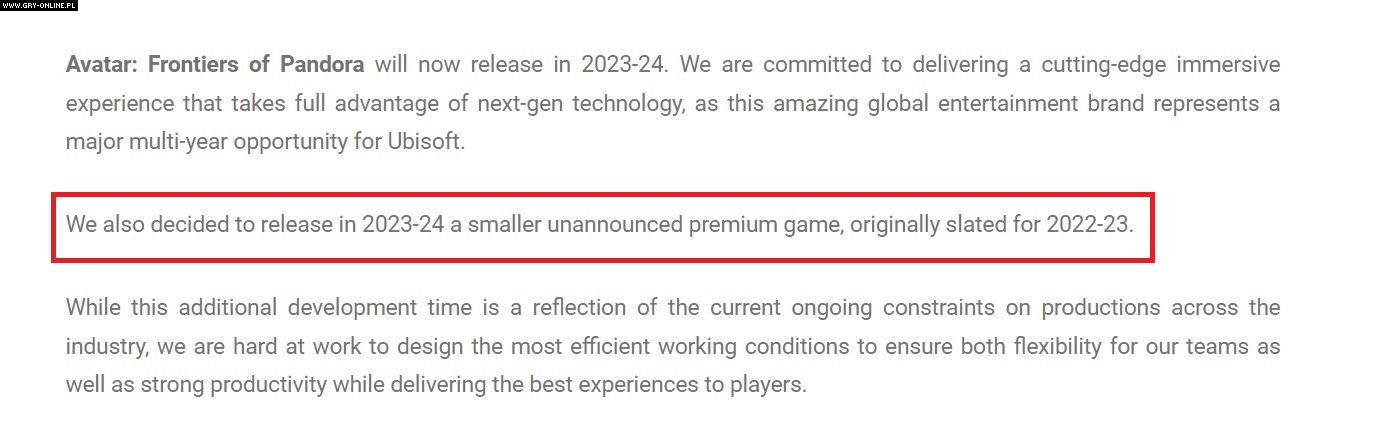Co ciekawe, los Avatara podzieliła jeszcze jedna, „mniejsza” produkcja „premium”, której premierę planowano na rok fiskalny 2022/23. Jej tytułu możemy jednak tylko się domyślać, bo nie została ona na razie oficjalnie zapowiedziana. Dość prawdopodobne wydaje się, że może chodzić o nastawiony na skradanie spin-off serii Assassin’s Creed – prawdopodobnie o podtytule Rift – który według ostatnich plotek ma nas zabrać do Bagdadu.