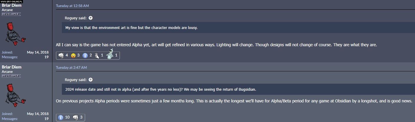 Briar Diem z Obsidianu włączył się do dyskusji na forum rpgcodex.net. Odpowiadając na zarzut jednego z użytkowników serwisu, który stwierdził, że „modele postaci są kiepskie”, twórca napisał: