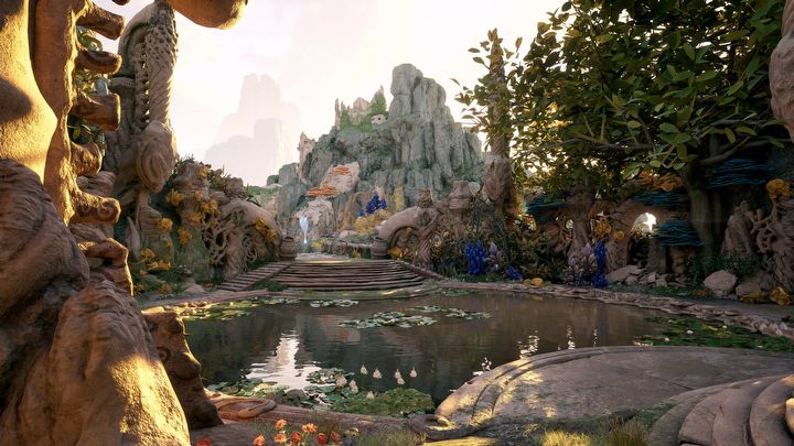 Struktura i projekt lokacji to jednak nie wszystko, bo mam wrażenie, że w ruchu Avowed wygląda znacznie lepiej niż nawet na oficjalnych i odpowiednio dopracowanych screenach. W trakcie gry wrażenie zrobiło na mnie bardzo dobre oświetlenie i piękne kolory. Jedynym elementem powiązanym z oprawą graficzną, który nieco odstaje od tej wspaniałej wizji, jaką tu roztaczam, jest mimika twarzy NPC. Ta wydaje się albo niedokończona, albo zwyczajnie dość drewniana. Szczególnie widać to w momentach, gdy postać ma się zaśmiać – wówczas sztywno otwiera usta i tyle, nie zdradza żadnych przejawów rzeczywistej radości. Momentami jest to tak nienaturalne, że naprawdę nie jestem w stanie stwierdzić, czy wynika to z trwających nadal prac, czy może element ten również w dniu premiery będzie wzbudzał konsternację.