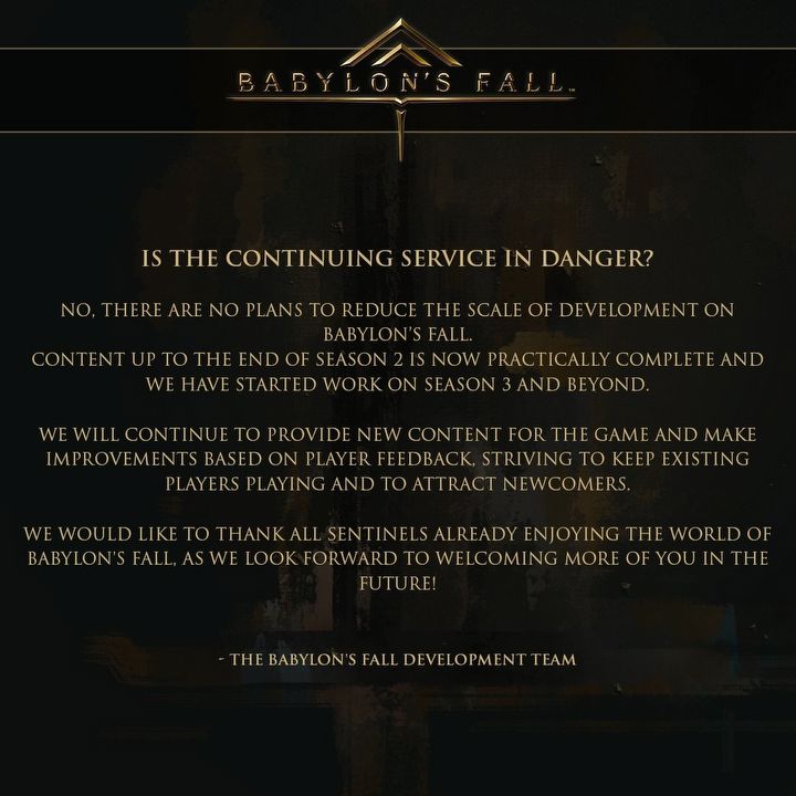 Mimo że Babylon's Fall okazało się porażką, to ani studio PlatinumGames, ani firma Square Enix nie zamierzają porzucać gry. Ba, zawartość drugiego sezonu rozgrywek sieciowych ma być już prawie ukończona, a prace nad sezonem trzecim i kolejnymi – rozpoczęte.