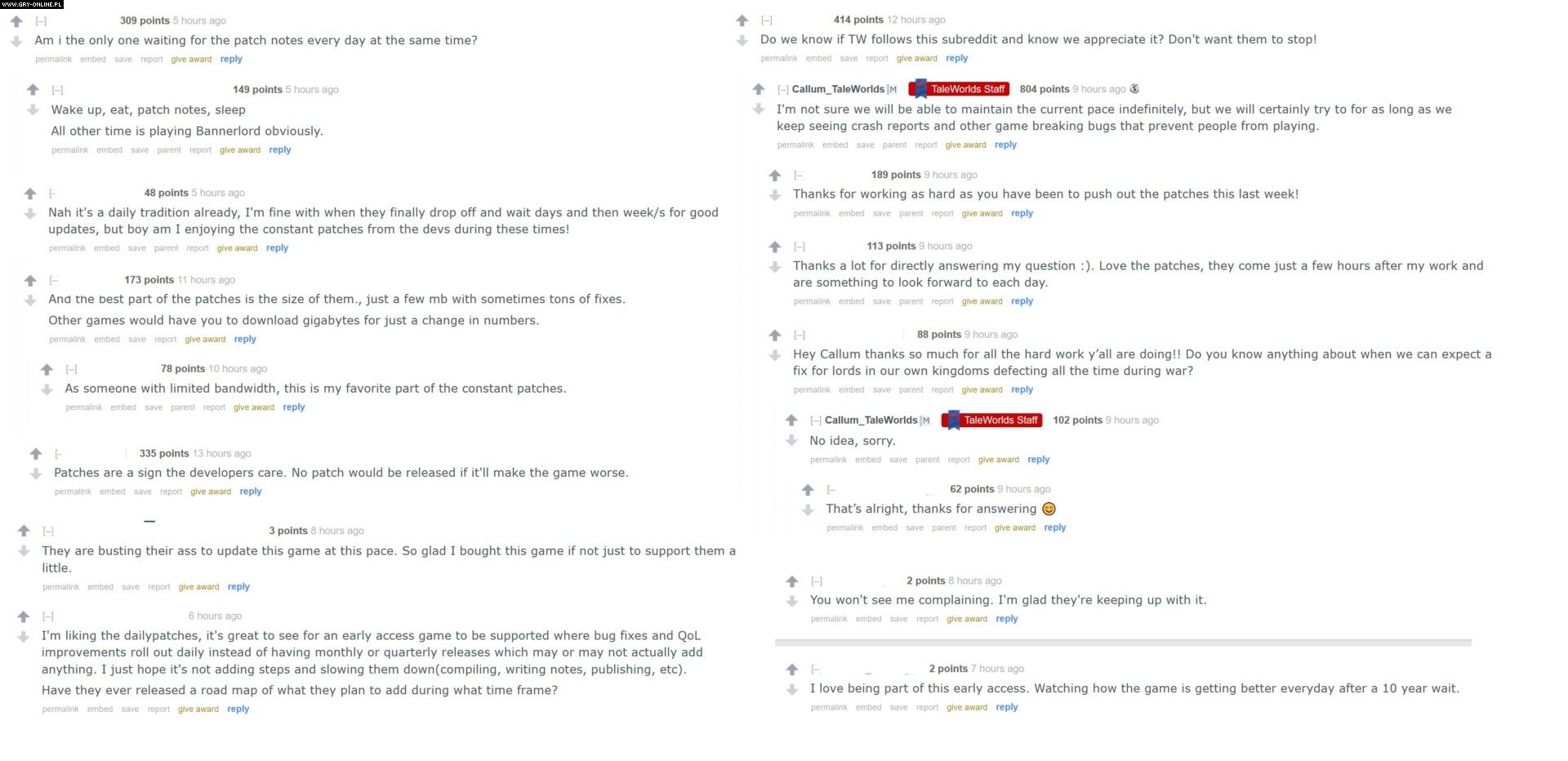 Po premierze Mount and Blade 2: Bannerlord we wczesnym dostępie deweloperzy ze studia TaleWorlds rozpoczęli proces intensywnego łatania swojego dzieła. Produkcja niemal codziennie otrzymuje jakąś aktualizację, a gracze chwalą twórców za wytężoną pracę.