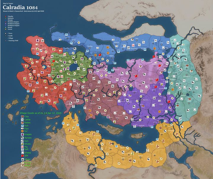 Jeden z graczy Mount & Blade II: Bannerlord przygotował mapę, która przedstawia surowce i dobra produkowane przez poszczególne wioski na mapie gry. Jest ona aktualna dla wersji e1.1.0 tytułu.