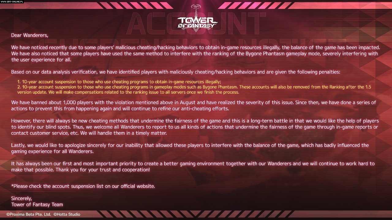 Tower of Fantasy rozwija się szybko, ale w tyle nie pozostają również cheaterzy. Twórcy poinformowali o zbanowaniu kolejnych kont, a także doprecyzowali kary, które spotkają przyszłych oszustów.