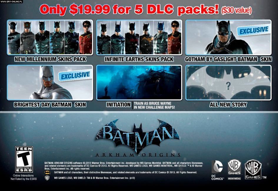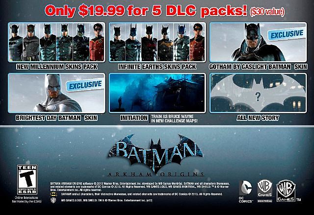 W zalewie dodatków typu DLC do gier, coraz większą popularność wśród graczy zyskują „przepustki sezonowe”. Na podobne rozwiązanie zdecydowała się firma Warner Interactive, wydawca gry Batman: Arkham Origins. Z oficjalnego komunikatu w tej sprawie wynika, że dzieło studia WB Games Montreal doczeka się w przyszłości co najmniej 5 DLC.