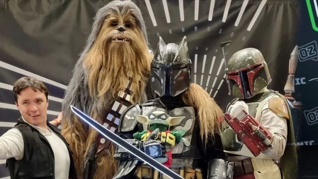 Artysta zademonstrował również uzbrojenie pasujące do kostiumu. Połączenie Batmana, a nawet lepiej Batmandalorianina, z mieczem i gadżetami Mrocznego rycerza, w towarzystwie Yodina – czyste złoto dla fanów science fiction!