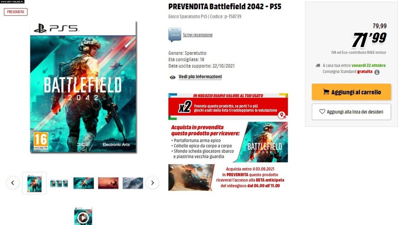 Na stronie internetowej Media World (włoskiej sieci supermarketów Media Markt) na karcie sprzedaży Battlefielda 2042 w wersji na PlayStation 5 przedwcześnie pojawiła się wiadomość o dacie bety tytułu. Ta rzekomo miałaby się rozpocząć już 6 września i potrwać przez 5 dni. Wziąć udział w niej mogliby jedynie ci gracze, którzy do 3 września złożyli pre-order na grę. Otwarta beta dla pozostałych także odbyłaby się we wrześniu, ale w późniejszym terminie.