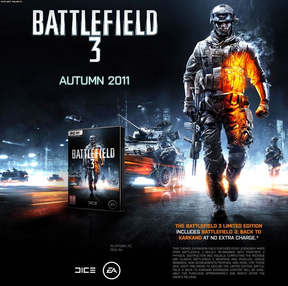 Wspomniane DLC nazwane zostało Back to Karkand. Znajdziemy w nim cztery cieszące się olbrzymią sympatią graczy mapy z Battlefield 2, jak również pochodzące z tej gry bronie i pojazdy. Grafika wszystkich poziomów zostanie naturalnie stworzona od nowa, tak by wykorzystać możliwości silnika Frostbite 2. Dodatek wprowadzi także dodatkowe Osiągnięcia. Co warte podkreślenia, osoby które nabędą Edycję Limitowaną Battlefield 3 otrzymają to DLC za darmo. Nabywcy standardowych wydań będą mogli zakupić Back to Karkand miesiąc po premierze podstawowej wersji gry. Pre-ordery na Edycję Limitowaną można już składać w sklepie GRY-OnLine. Wersję pecetową wyceniono na 129,90 złotych, podczas gdy za konsolowe (PlayStation 3 oraz Xbox 360) zapłacić trzeba będzie 189,90 zł.
