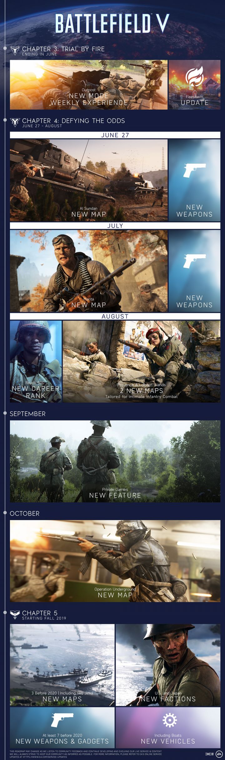 Podczas dzisiejszej prezentacji w ramach EA Play 2019 zaprezentowane zostały plany na najbliższą przyszłość Battlefielda V. Rodział czwarty przyniesie cztery nowe mapy, nowy system rankingowy i prywatne serwery. W rozdziale piątym weźmiemy udział w potyczkach na Pacyfiku i odwiedzimy Iwo Jimę.