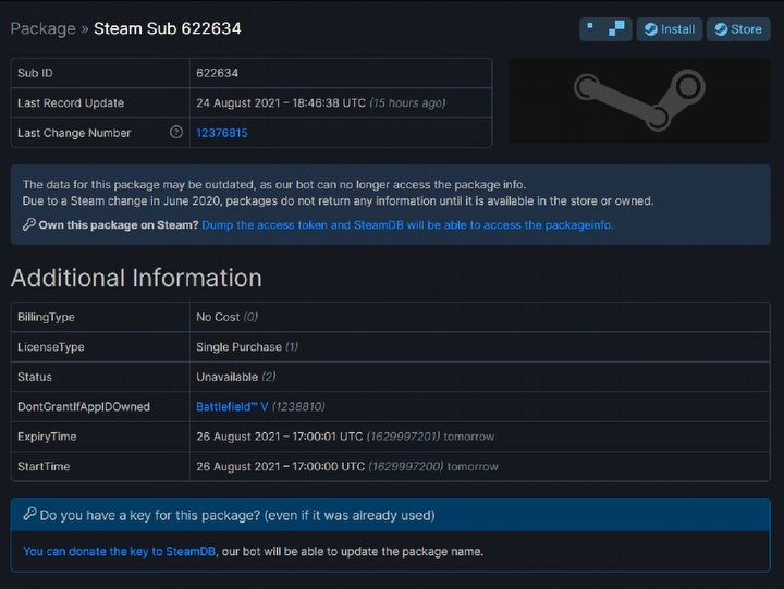 Wygląda na to, że o darmowej kopii Battlefielda V na Steamie można zapomnieć. Serwis SteamDB poinformował bowiem, że wpis znaleziony w jego bazie danych był po prostu błędem i został usunięty. Cóż, szkoda. Przypominamy jednak, że tytuł wciąż można zgarnąć za darmo na Amazonie – szczegóły znajdziecie tutaj.