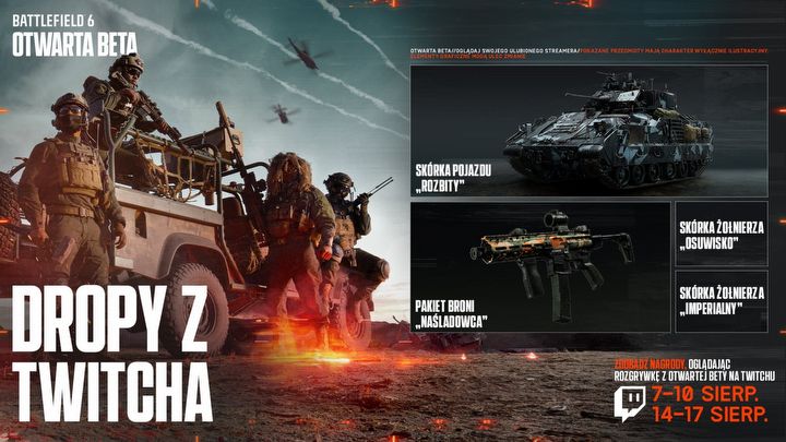 Kolejne nagrody można zdobyć za oglądanie swoich ulubionych streamerów na Twitchu. Wystarczy powiązać swoje konto EA z kontem Twitch i oglądać transmisje z gry przez co najmniej godzinę. Przedłużając oglądanie do 4 godzin, zdobędziemy wszystkie nagrody, czyli skórki na broń, pojazd oraz żołnierzy, które należy odebrać w ciągu 24 godzin z ekwipunku dropów.