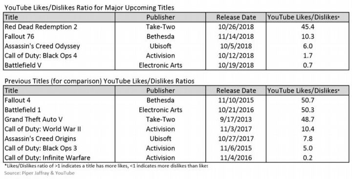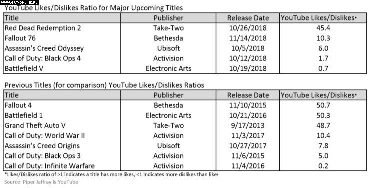W podobnym tonie wypowiedzieli się eksperci banku Piper Jaffray, opierając się na wynikach ankiety przeprowadzonej na ponad trzystu amerykańskich graczach (podajemy za serwisem WccfTech). Ankietowanych zapytano o najbardziej oczekiwany przez nich tytuł w tym roku spośród pięciu wysokobudżetowych pozycji. Battlefield V znalazło się na samym dole listy, wyprzedzone przez Fallout 76, Assassin’s Creed Odyssey, Red Dead Redemption II oraz Call of Duty: Black Ops IIII. W raporcie znalazły się też dane dotyczące popularności tych gier na YouTube, mierzone przez stosunek ocen pozytywnych do negatywnych dla powiązanych filmików. Także tu nadchodzący Battlefield znalazł się na samym dole, tym razem zaraz za czwartym Black Ops. Wypada to szczególnie źle w porównaniu z drugim miejscem Battlefield 1, które zostawiło daleko w tyle Call of Duty: Infinite Warfare (na marginesie – futurystyczny CoD jest najmniej lubianą grą w całym zestawieniu).