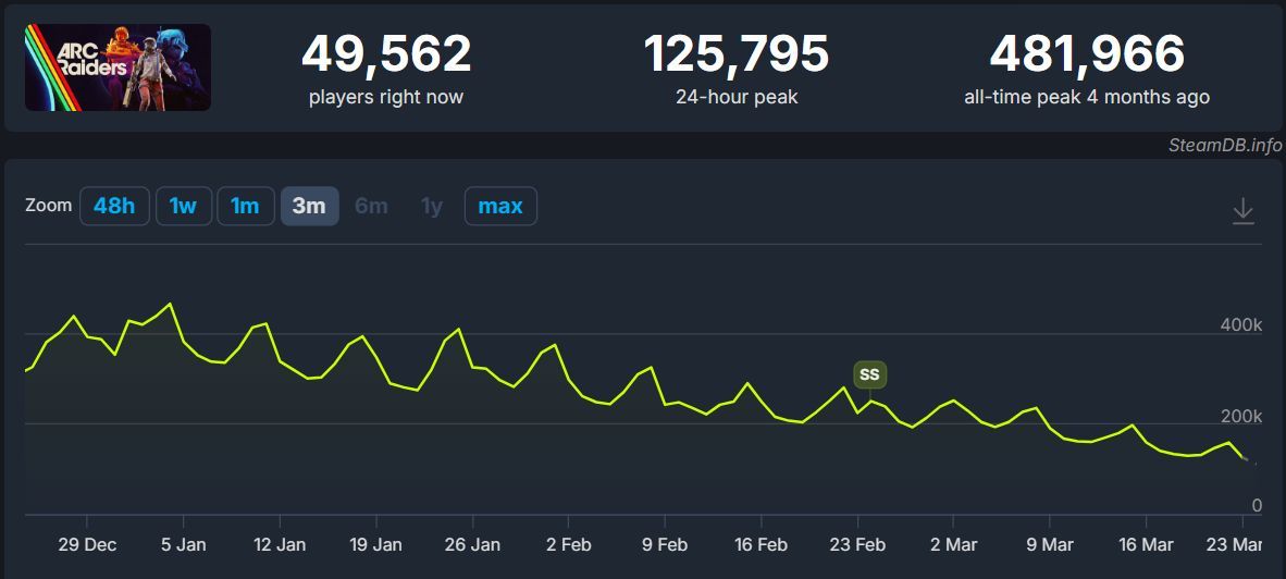 Miejmy nadzieję, że Embark Studios szykuje również coś znacznie bardziej interesującego, co zostanie ujawnione później. W przeciwnym razie aktualizacja Flashpoint może pozostawić część fanów z niedosytem. Z pewnością nie wpłynie to dobrze na zainteresowane grą, które według SteamDB jest coraz słabsze. Wykres jasno wskazuje, że gracze powoli odchodzą od ARC Raiders.